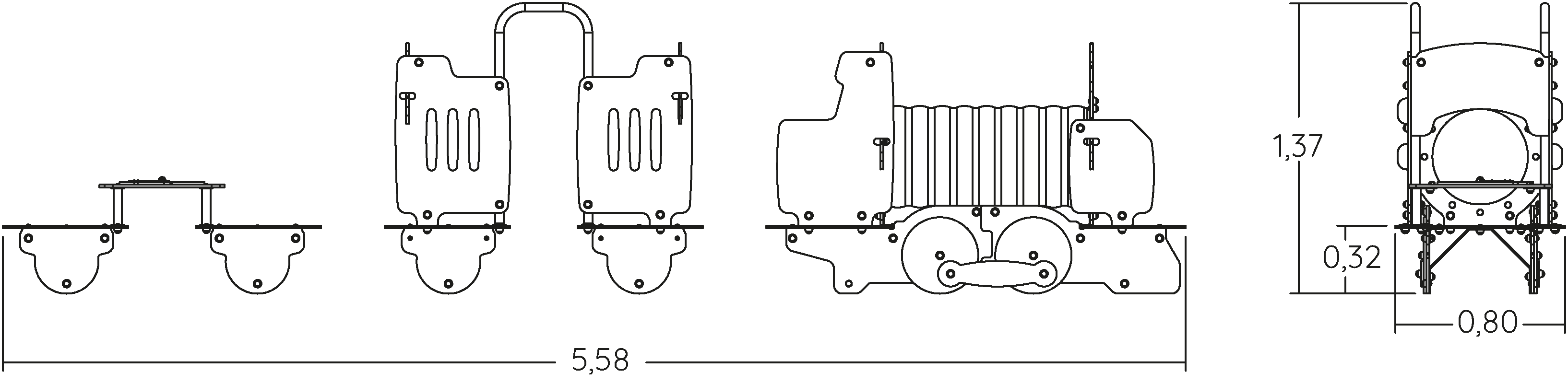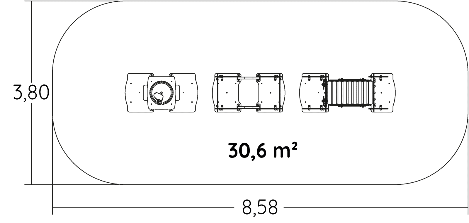 Las dimensiones del módulo son: 5,60 m de longitud, 0,80 m de ancho, 1,40 m de alto. La altura de caída libre (ACL) es de 0,86 m.