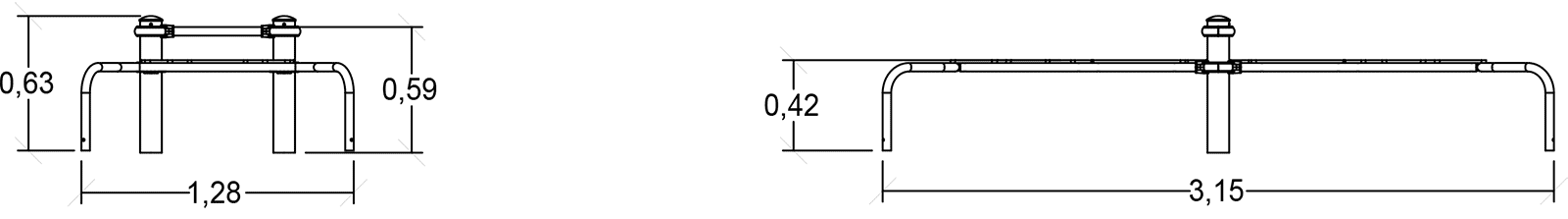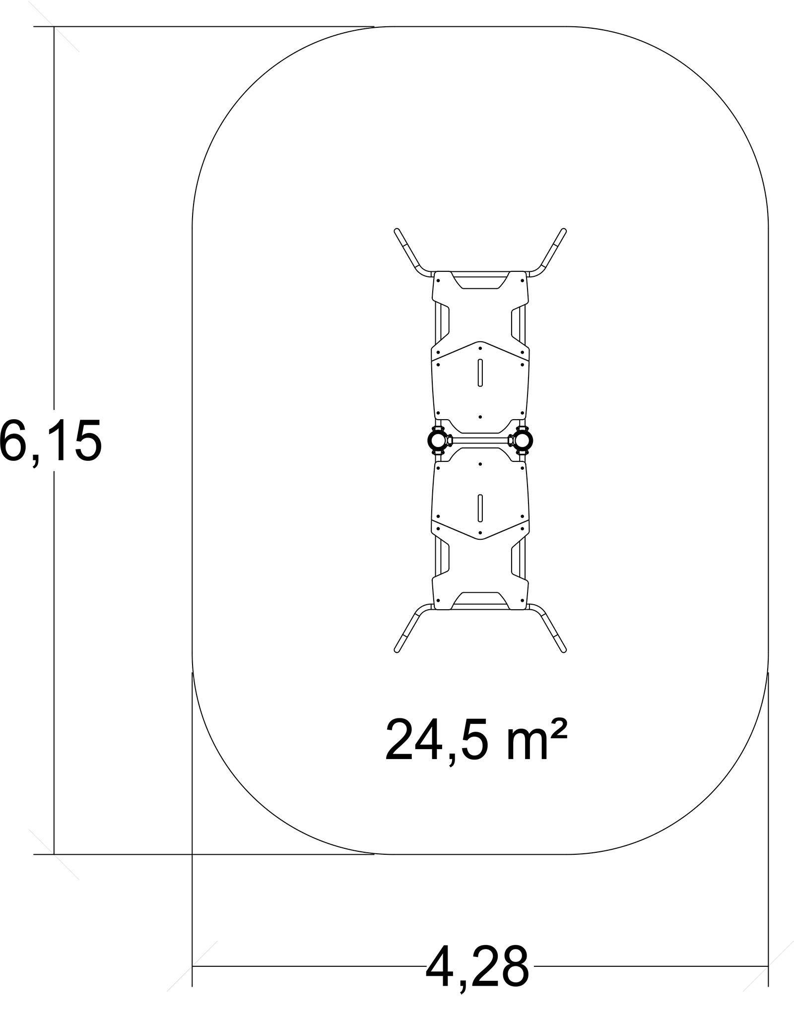 Las dimensiones del módulo son: 3,15 m de longitud, 1,28 m de ancho, 0,64 m de alto. La altura de caída libre (ACL) es de 0,60 m.