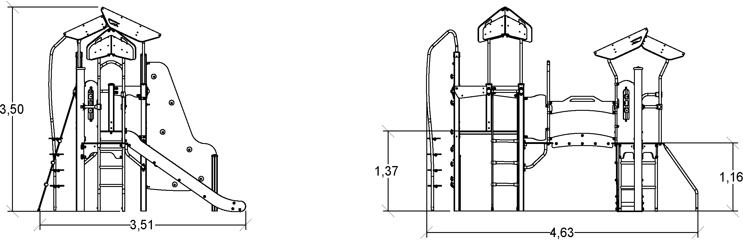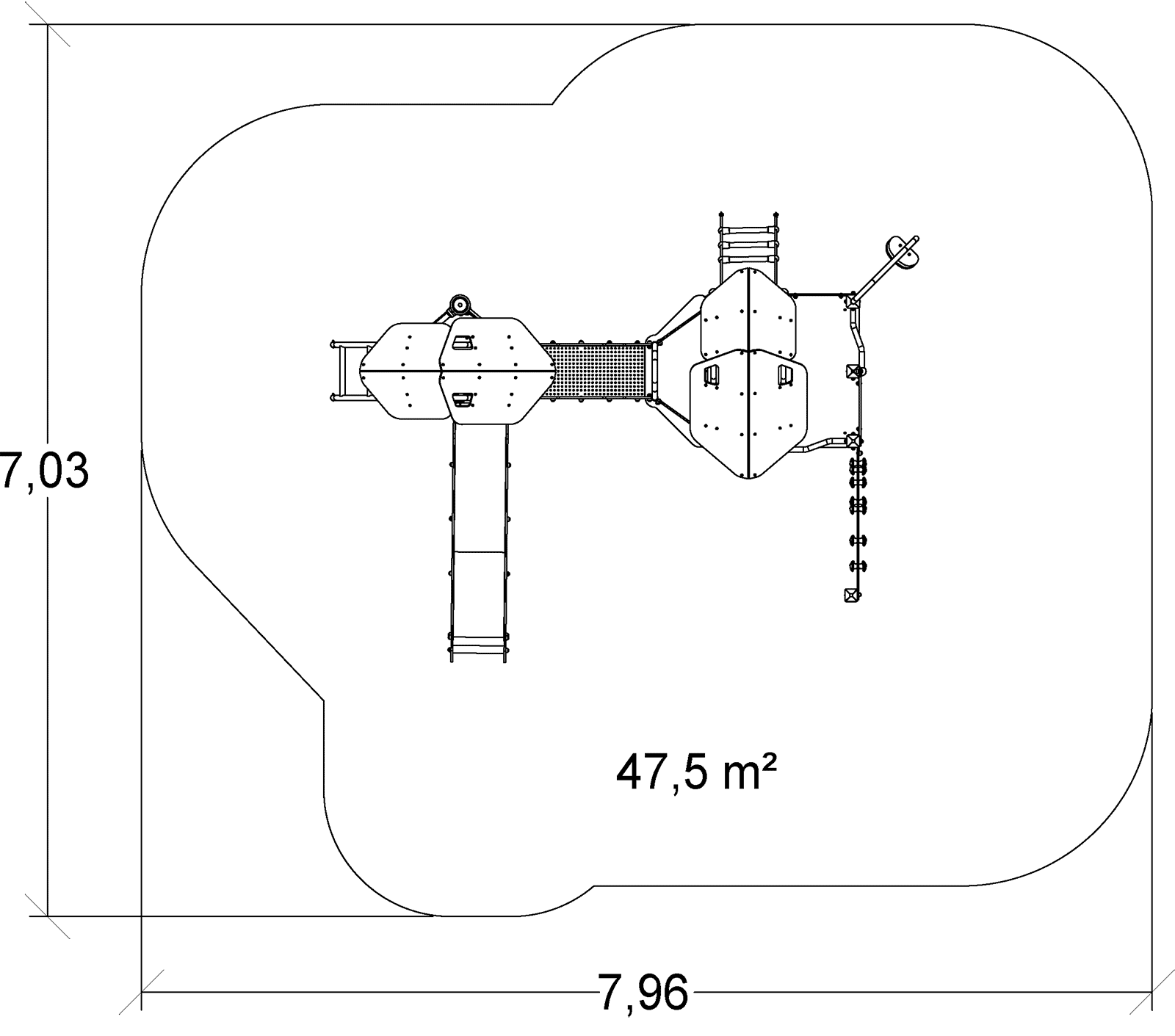 Las dimensiones del módulo son: 4,64 m de longitud, 3,51 m de ancho, 3,49 m de alto. La altura de caída libre (ACL) es de 2,60 m.