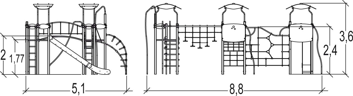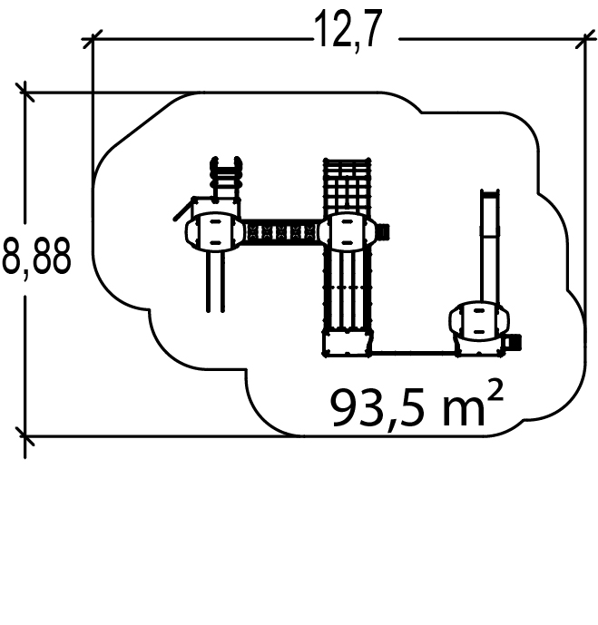 Las dimensiones del módulo son: 8,95 m de longitud, 5,20 m de ancho, 3,60 m de alto. La altura de caída libre (ACL) es de 2,50 m.