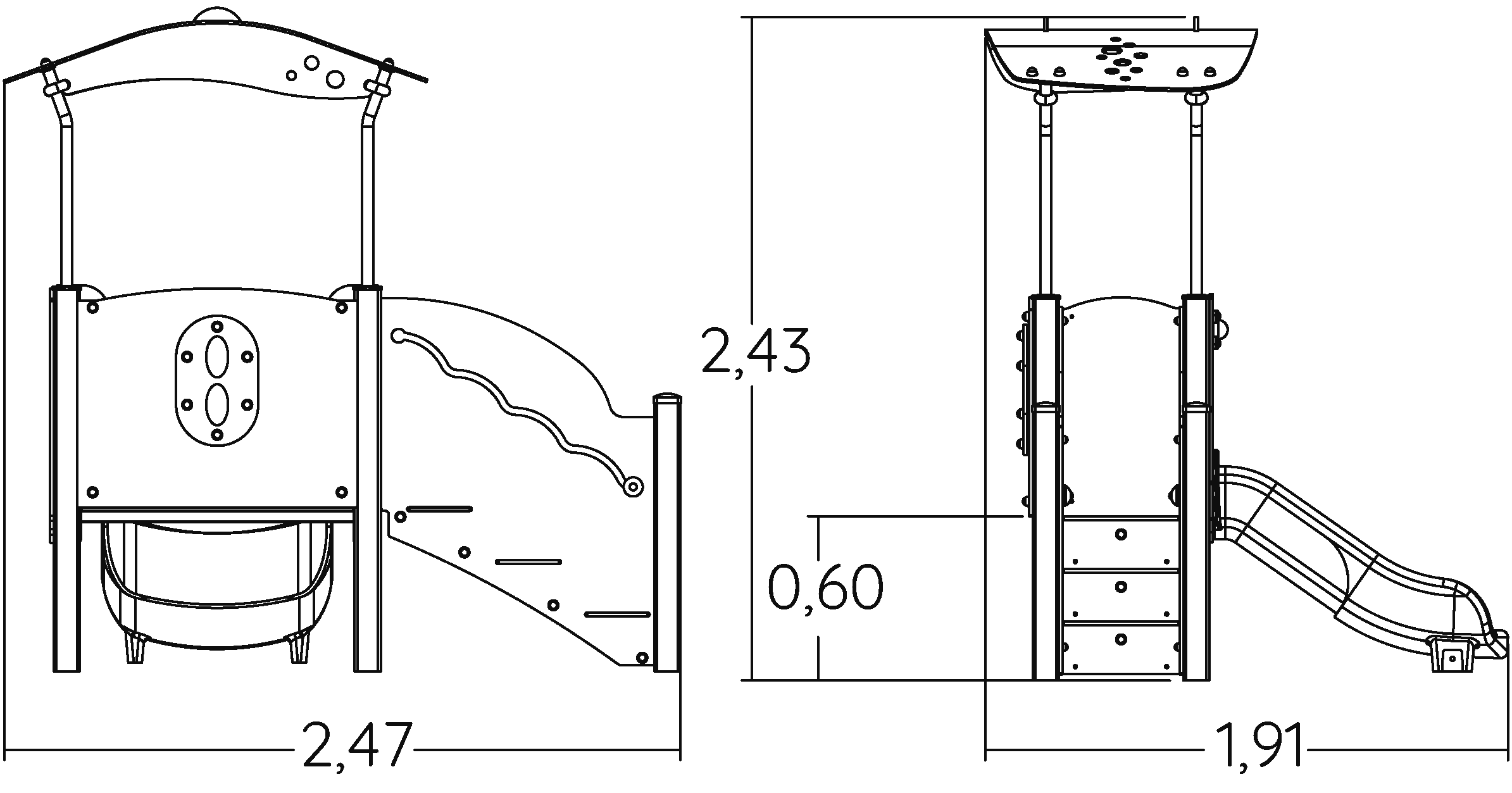 Las dimensiones del módulo son: 2,47 m de longitud, 1,91 m de ancho, 2,43 m de alto. La altura de caída libre (ACL) es de 1,00 m.
