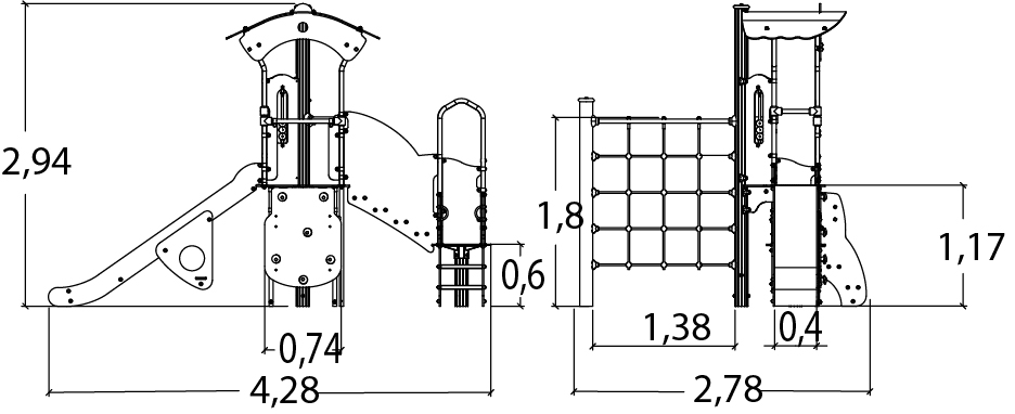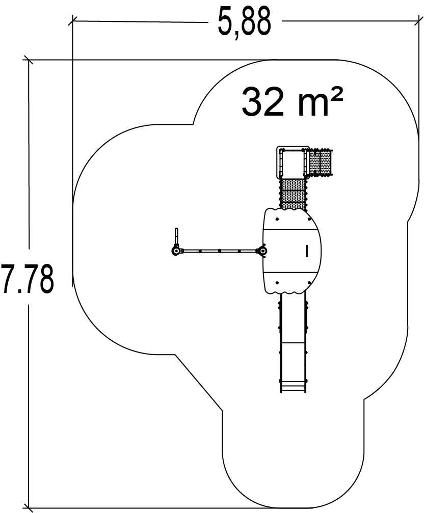 Las dimensiones del módulo son: 4,28 m de longitud, 2,78 m de ancho, 2,94 m de alto. La altura de caída libre (ACL) es de 1,80 m.