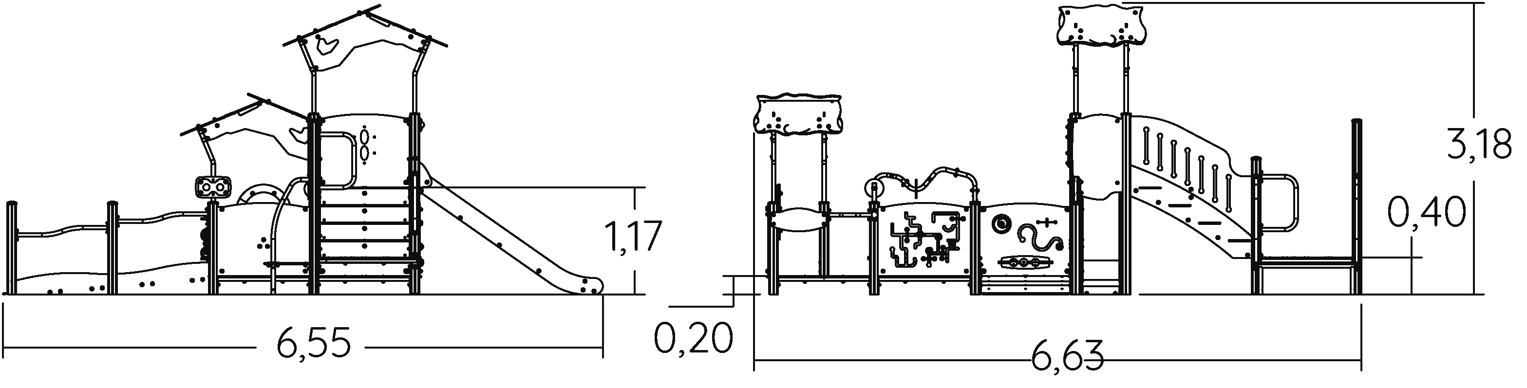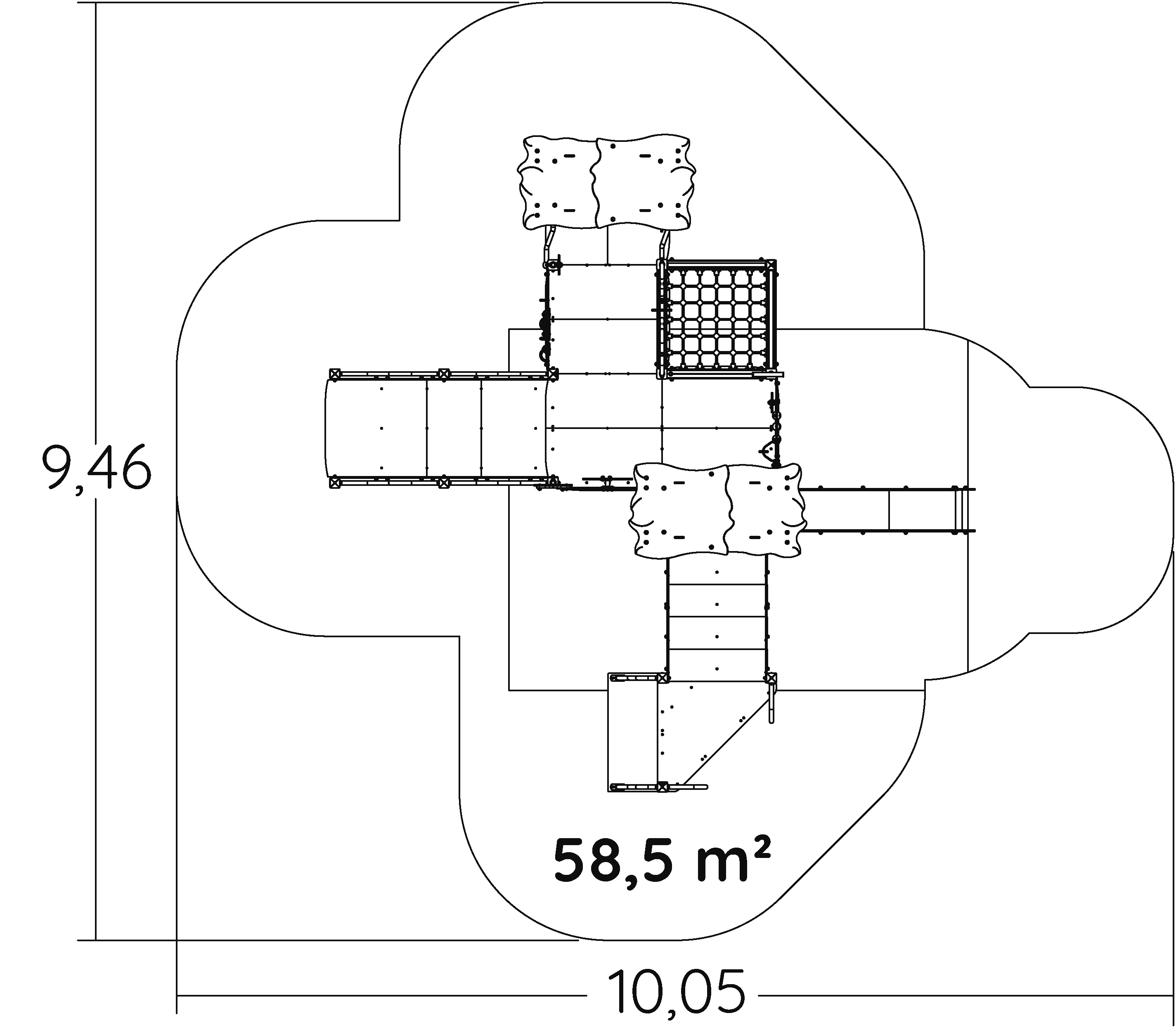 Las dimensiones del módulo son: 6,63 m de longitud, 6,55 m de ancho, 3,17 m de alto. La altura de caída libre (ACL) es de 1,17 m.