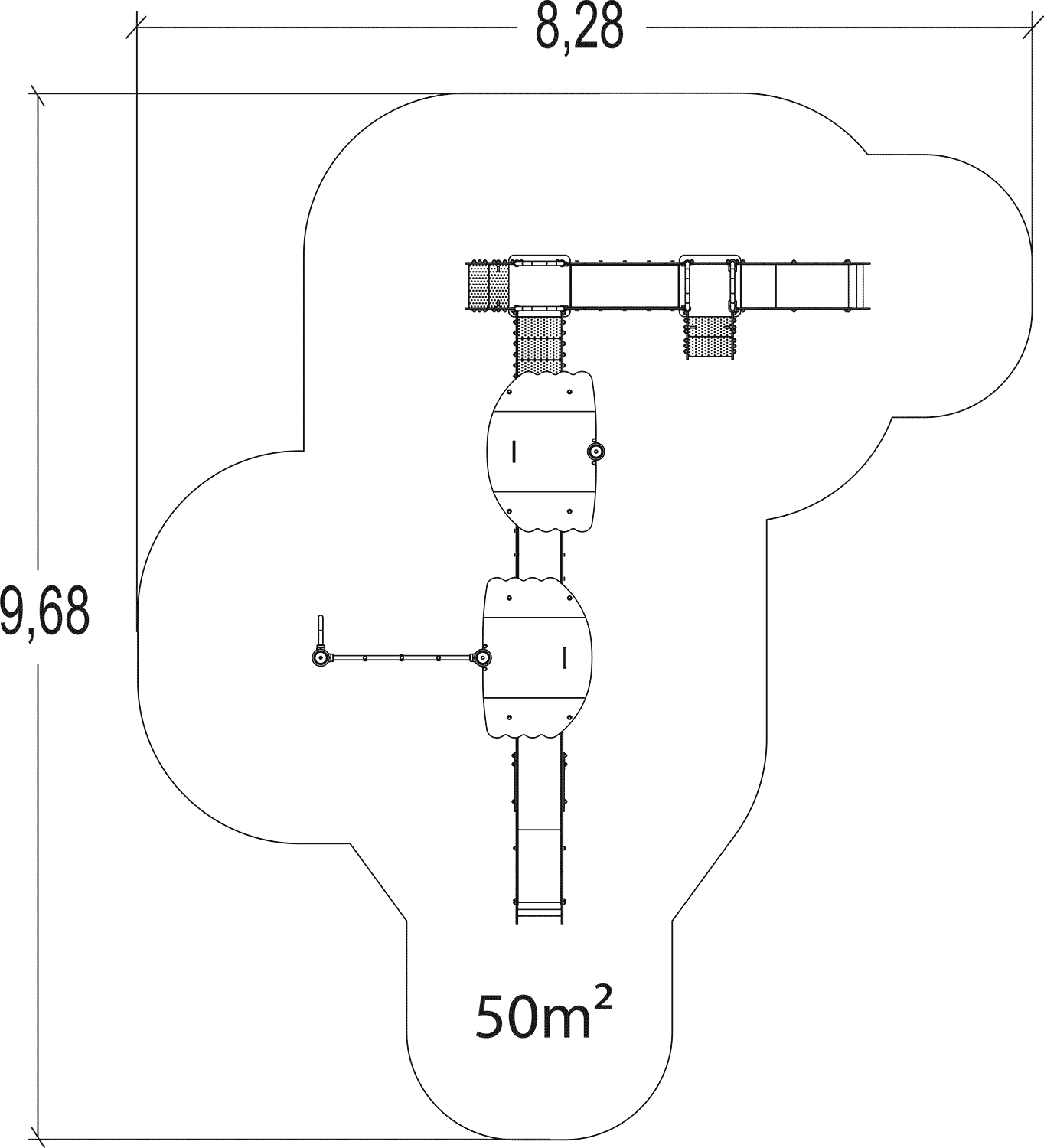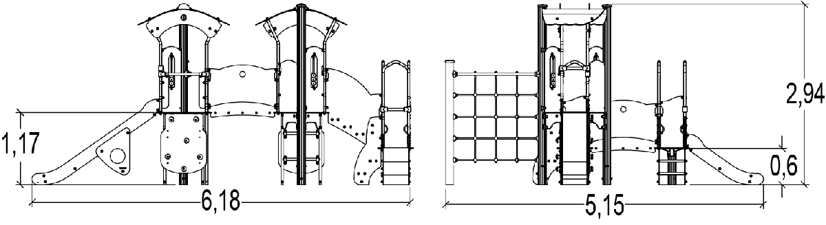 Las dimensiones del módulo son: 6,18 m de longitud, 5,15 m de ancho, 2,94 m de alto. La altura de caída libre (ACL) es de 1,80 m.