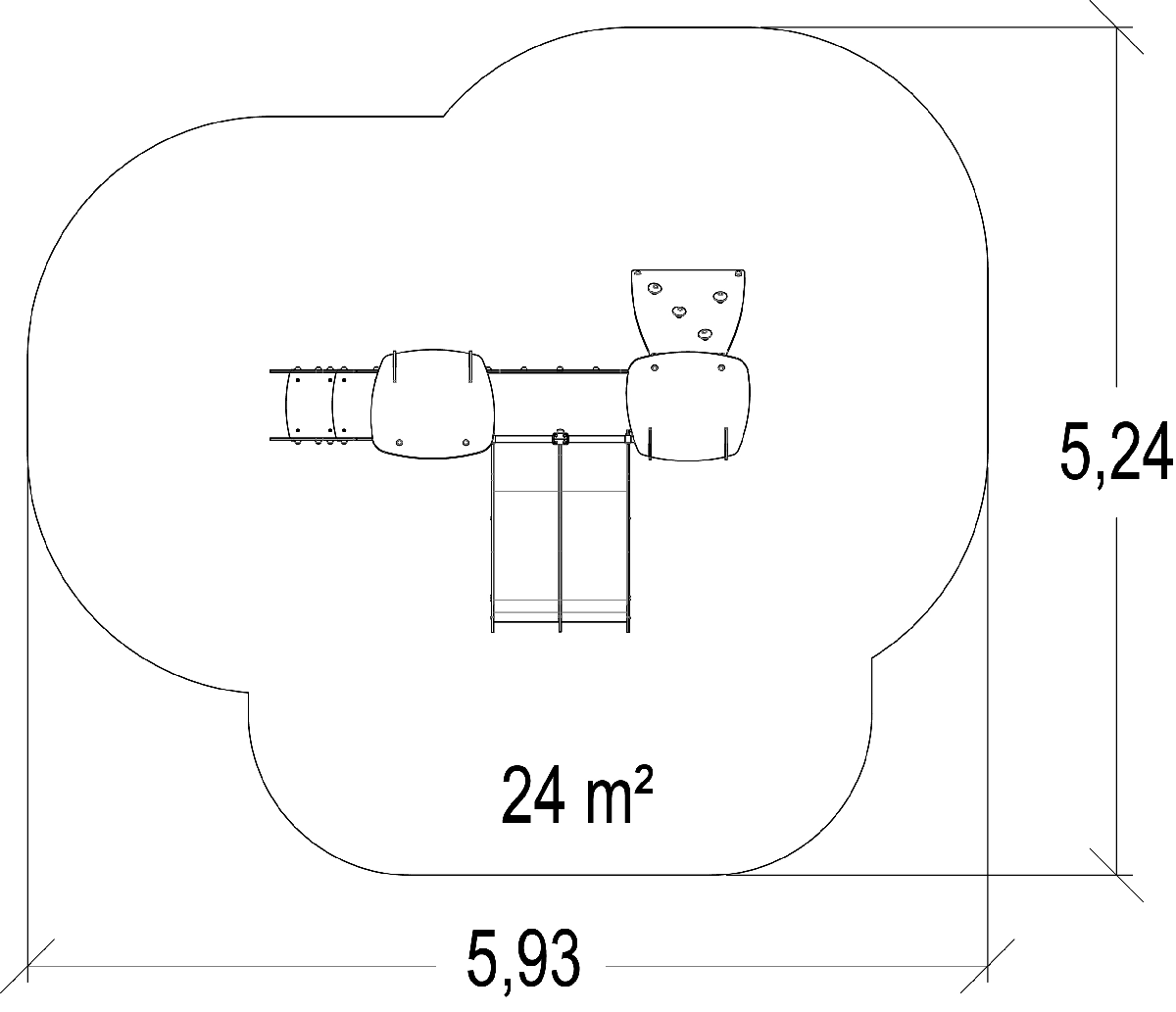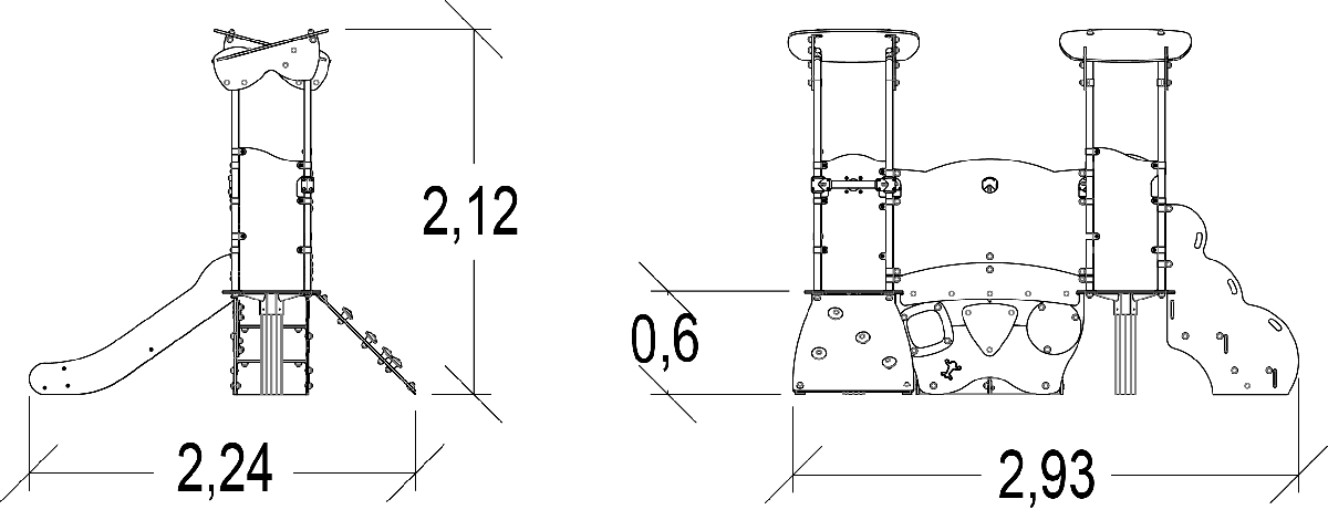 Las dimensiones del módulo son: 2,93 m de longitud, 2,24 m de ancho, 2,12 m de alto. La altura de caída libre (ACL) es de 1,00 m.