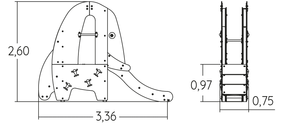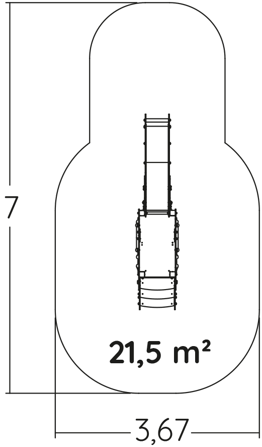 Las dimensiones del módulo son: 3,50 m de longitud, 0,75 m de ancho, 2,60 m de alto. La altura de caída libre (ACL) es de 1,00 m.