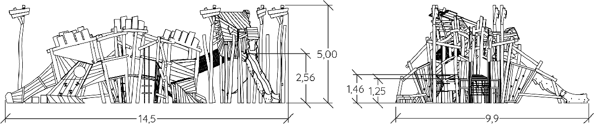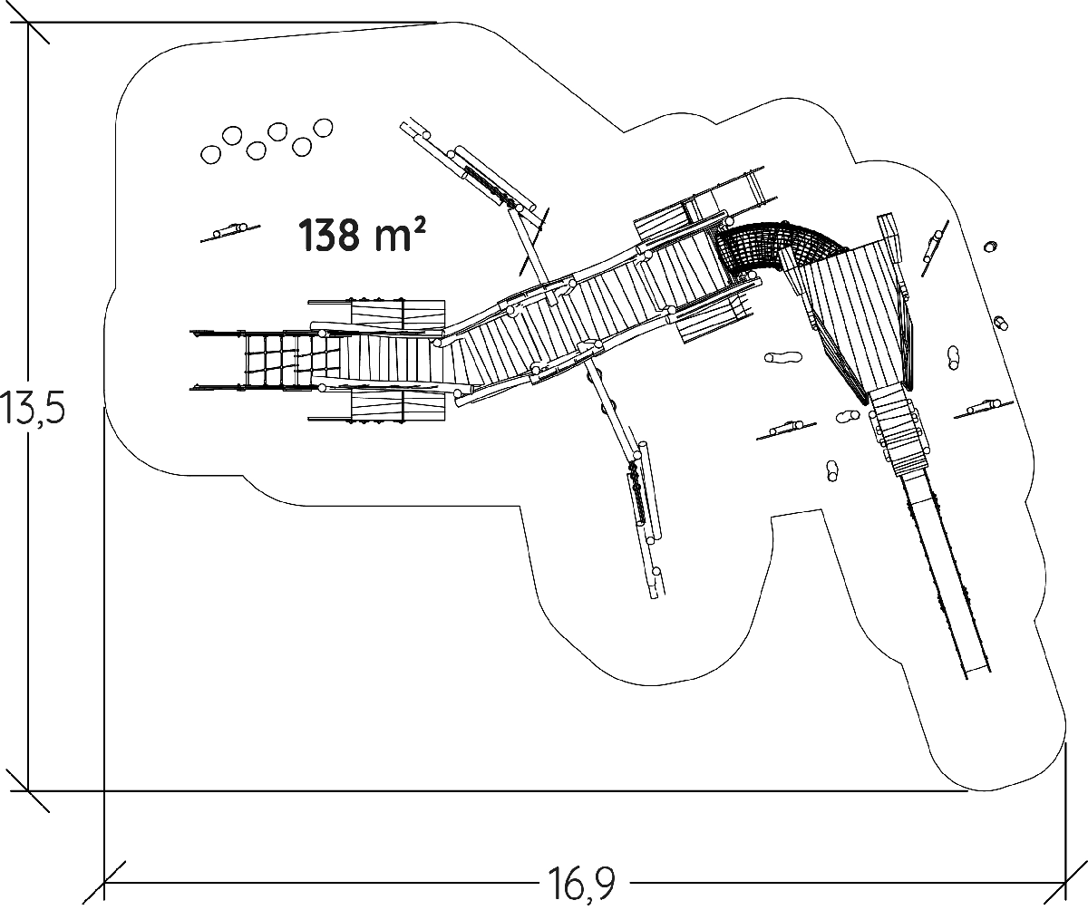 Las dimensiones del módulo son: 14,50 m de longitud, 9,90 m de ancho, 5,00 m de alto. La altura de caída libre (ACL) es de 2,37 m.