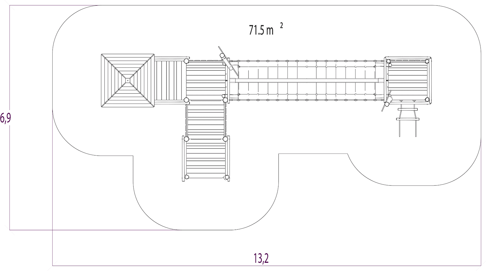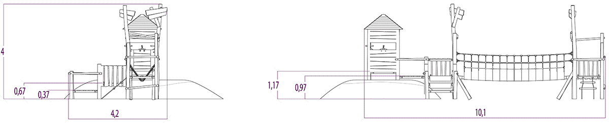 Las dimensiones del módulo son: 10,21 m de longitud, 3,93 m de ancho, 3,95 m de alto. La altura de caída libre (ACL) es de 0,97 m.