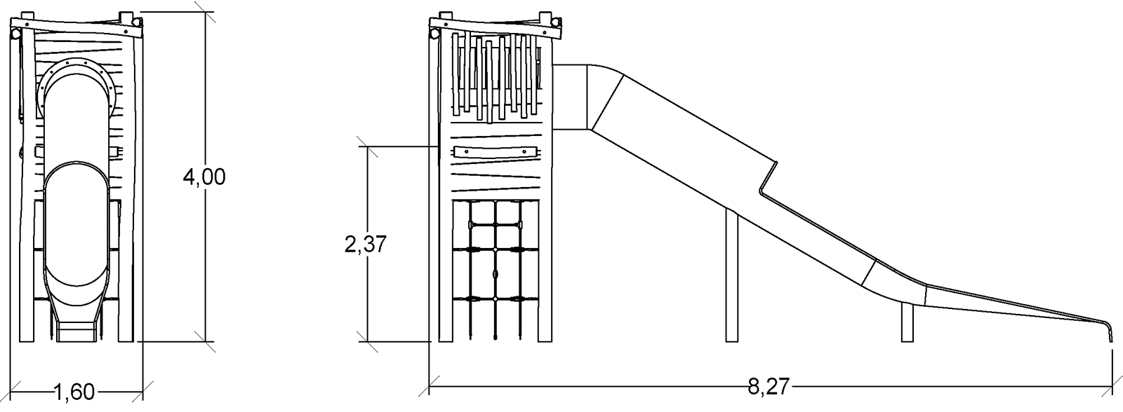 Las dimensiones del módulo son: 8,26 m de longitud, 1,59 m de ancho, 3,99 m de alto. La altura de caída libre (ACL) es de 2,37 m.