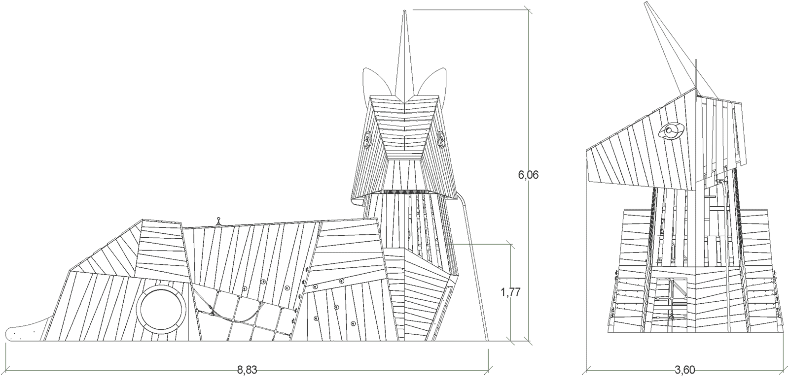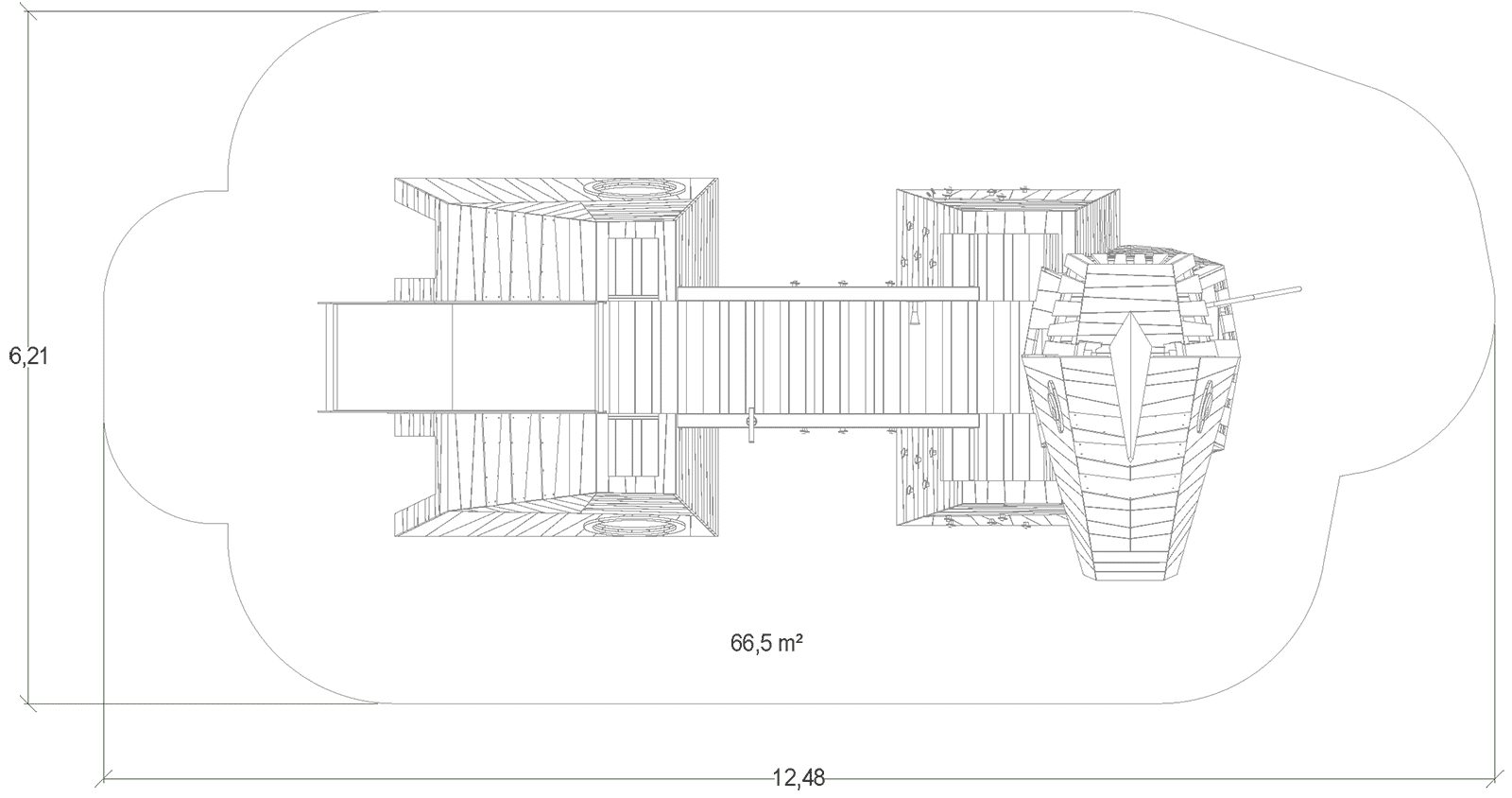 Las dimensiones del módulo son: 8,83 m de longitud, 3,60 m de ancho, 6,06 m de alto. La altura de caída libre (ACL) es de 1,80 m.