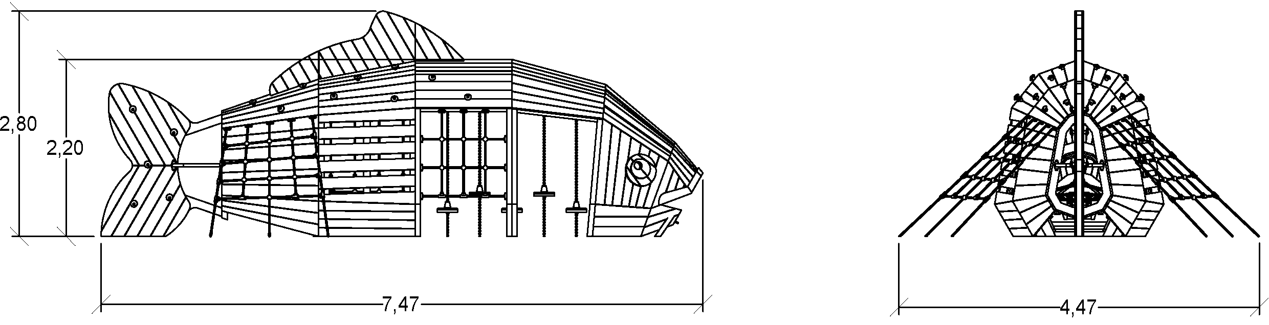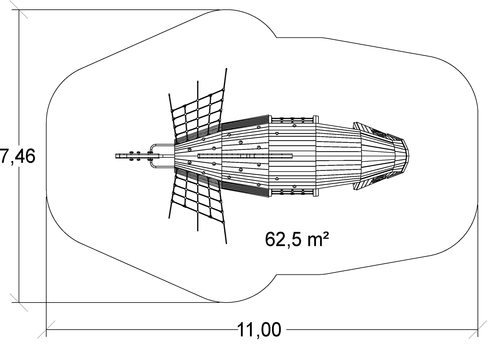 Las dimensiones del módulo son: 7,47 m de longitud, 4,47 m de ancho, 2,80 m de alto. La altura de caída libre (ACL) es de 2,20 m.