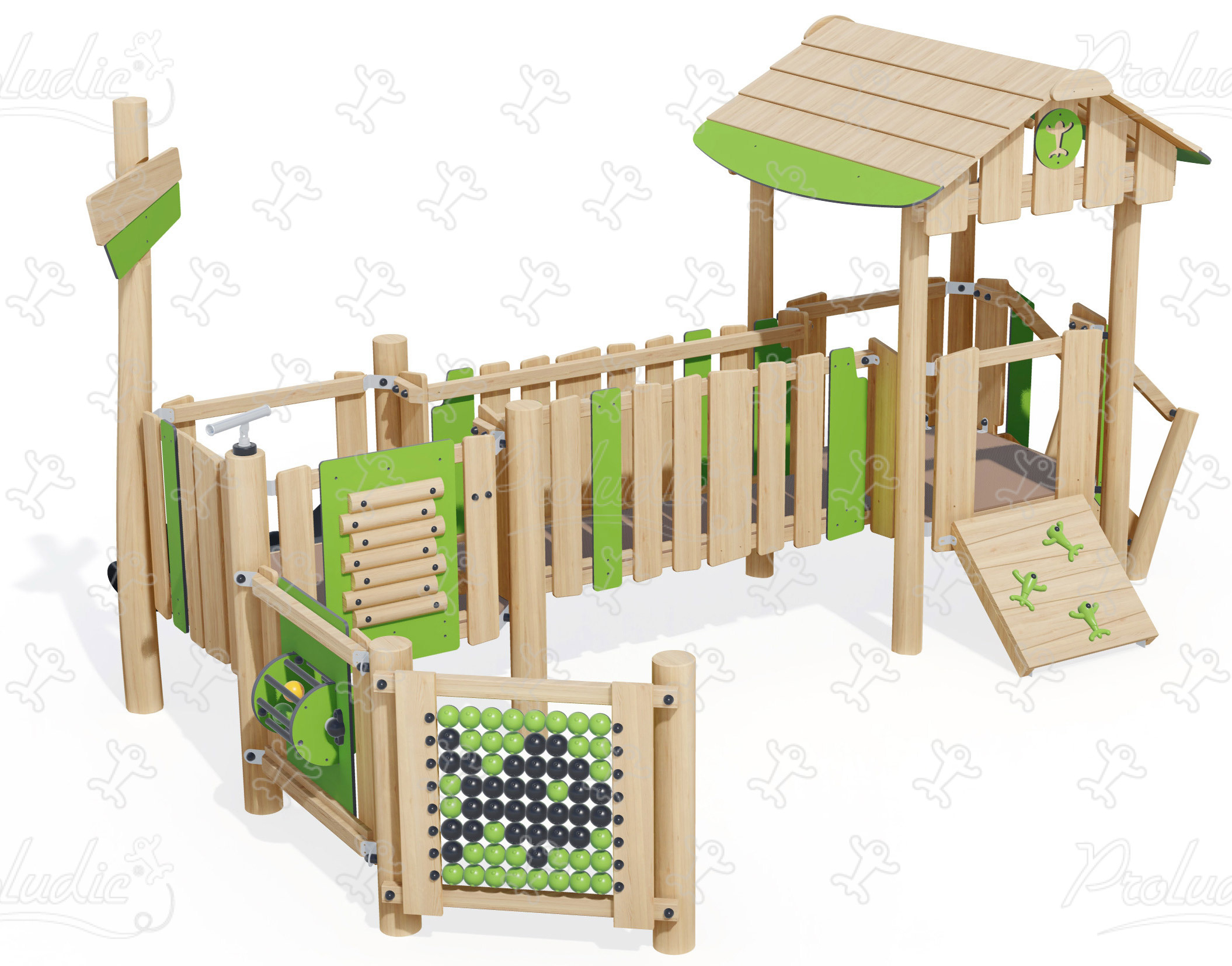 Estructura de juego de madera para niños pequeños con tobogán, cabina y panel de juego. - J49250®