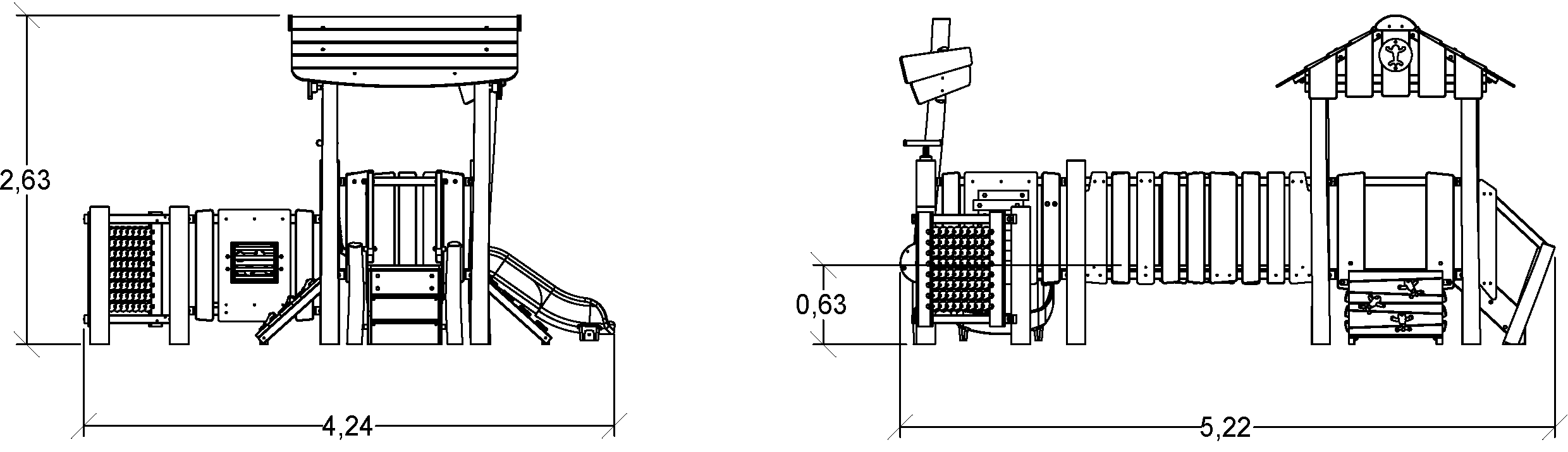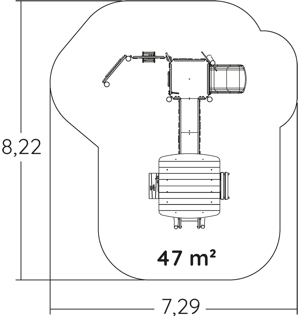 Las dimensiones del módulo son: 5,22 m de longitud, 4,24 m de ancho, 2,63 m de alto. La altura de caída libre (ACL) es de 1,00 m.