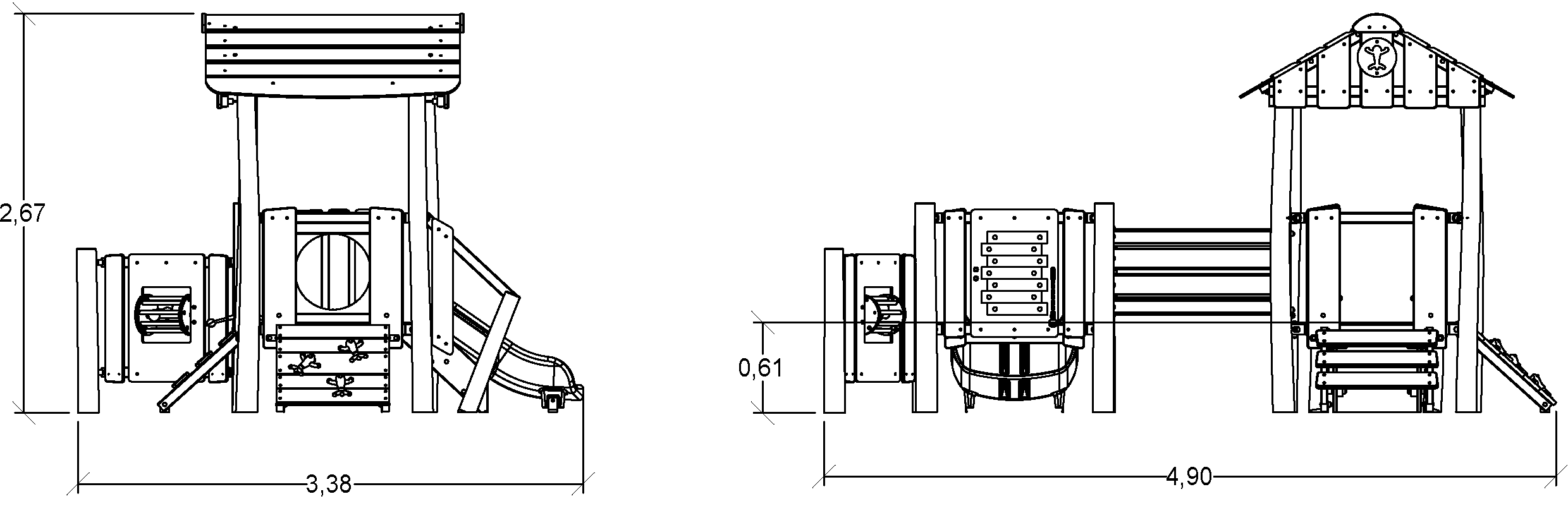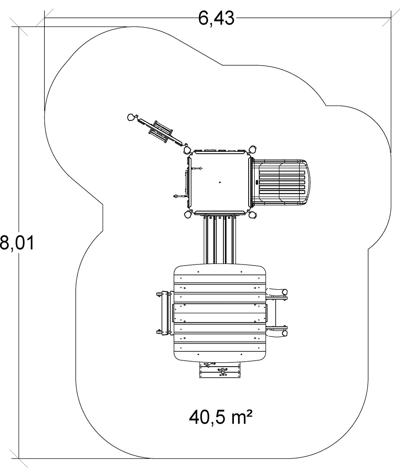 Las dimensiones del módulo son: 4,89 m de longitud, 3,39 m de ancho, 2,67 m de alto. La altura de caída libre (ACL) es de 1,00 m.