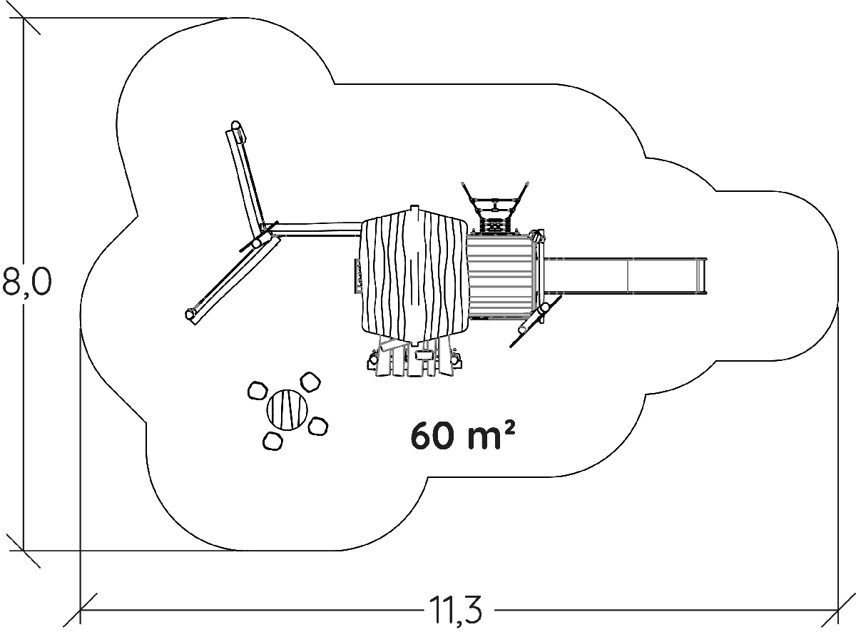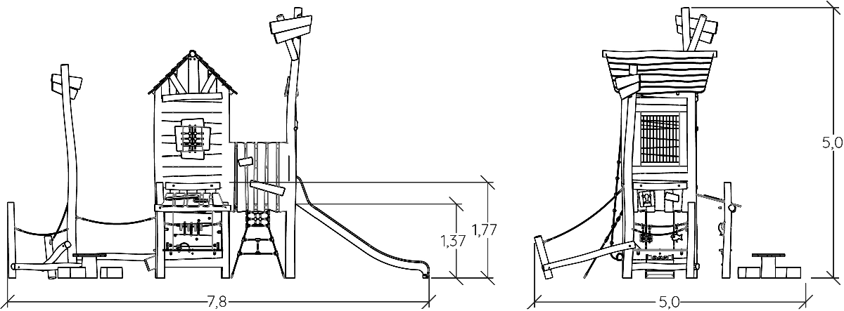 Las dimensiones del módulo son: 7,80 m de longitud, 5,00 m de ancho, 5,00 m de alto. La altura de caída libre (ACL) es de 1,77 m.
