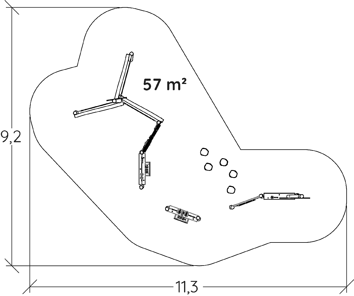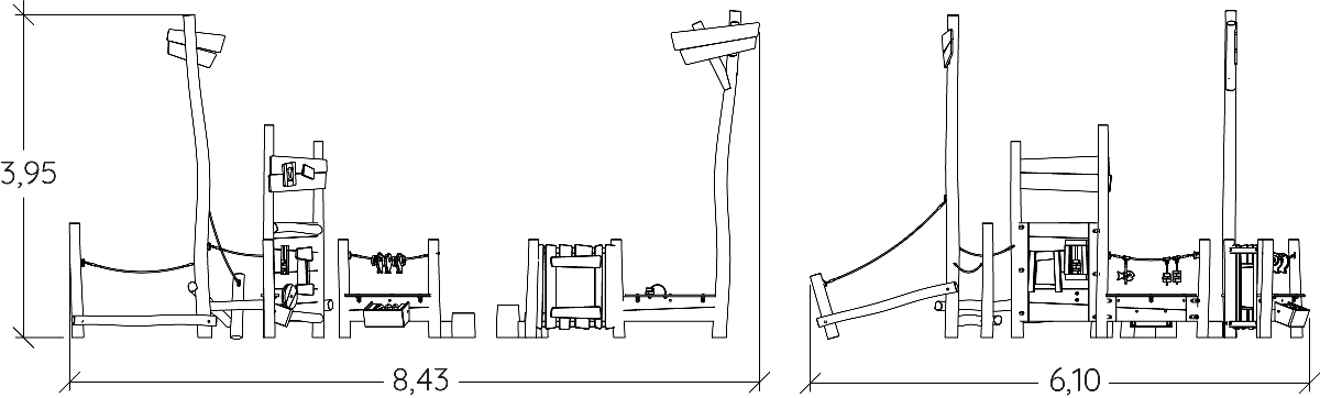 Las dimensiones del módulo son: 8,43 m de longitud, 6,10 m de ancho, 3,95 m de alto. La altura de caída libre (ACL) es de 0,60 m.