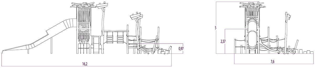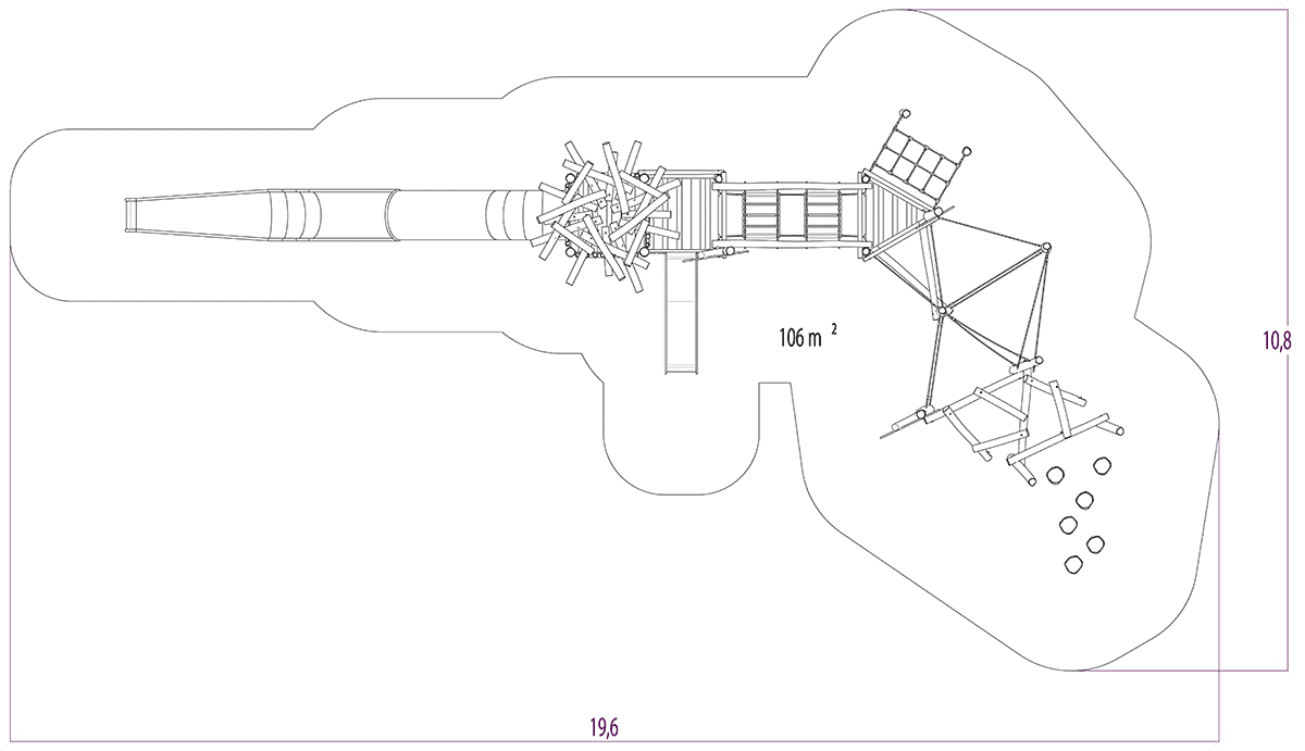 Las dimensiones del módulo son: 16,20 m de longitud, 7,20 m de ancho, 5,00 m de alto. La altura de caída libre (ACL) es de 1,50 m.