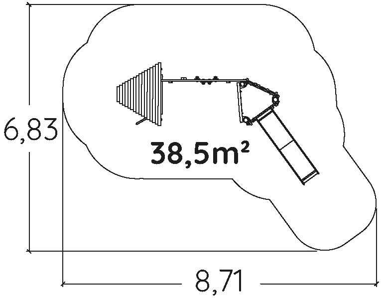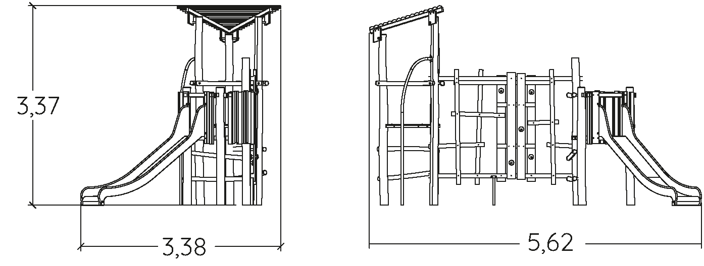 Las dimensiones del módulo son: 5,62 m de longitud, 3,38 m de ancho, 3,37 m de alto. La altura de caída libre (ACL) es de 2,40 m.