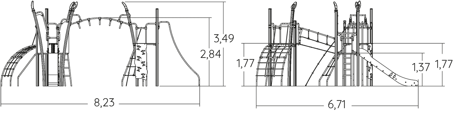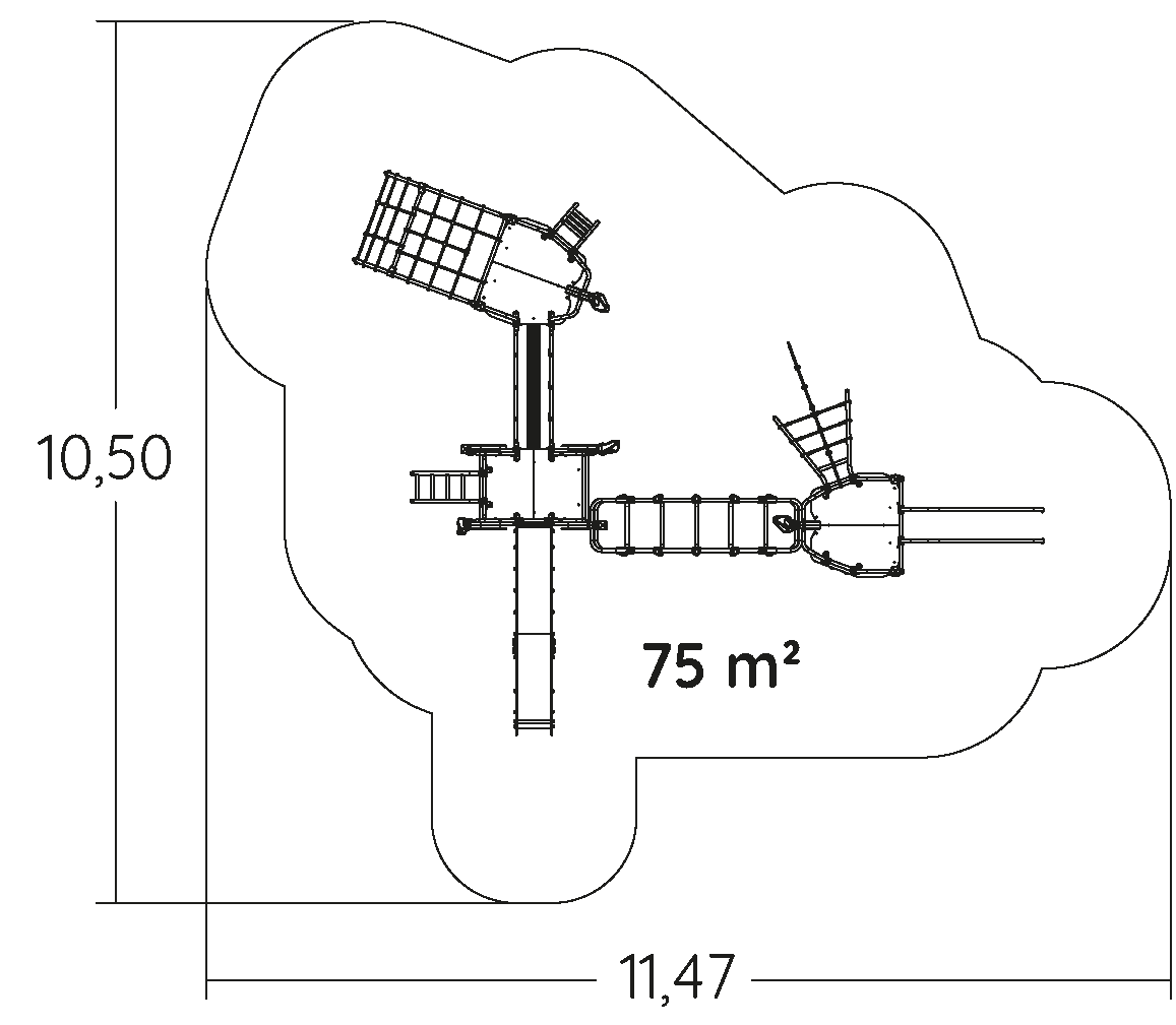 Las dimensiones del módulo son: 8,23 m de longitud, 6,71 m de ancho, 3,49 m de alto. La altura de caída libre (ACL) es de 2,85 m.