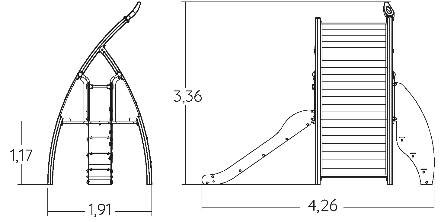 Las dimensiones del módulo son: 4,27 m de longitud, 1,92 m de ancho, 3,36 m de alto. La altura de caída libre (ACL) es de 1,17 m.