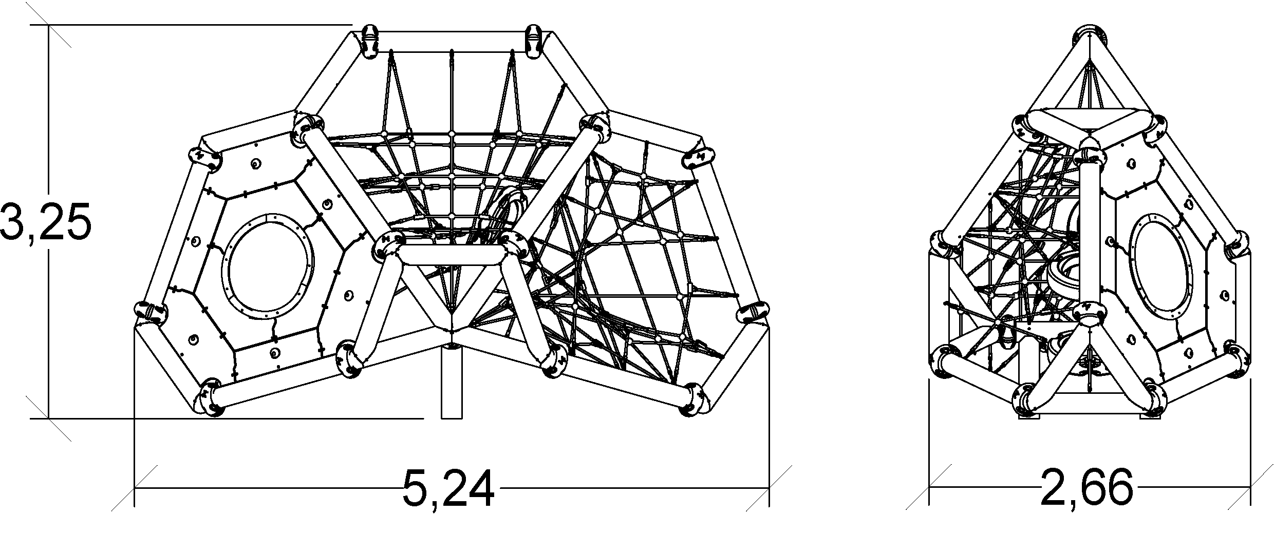 Las dimensiones del módulo son: 5,24 m de longitud, 2,66 m de ancho, 3,25 m de alto. La altura de caída libre (ACL) es de 2,50 m.